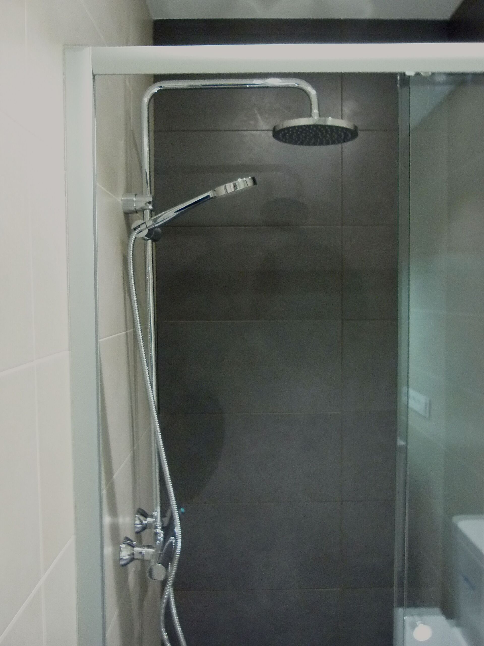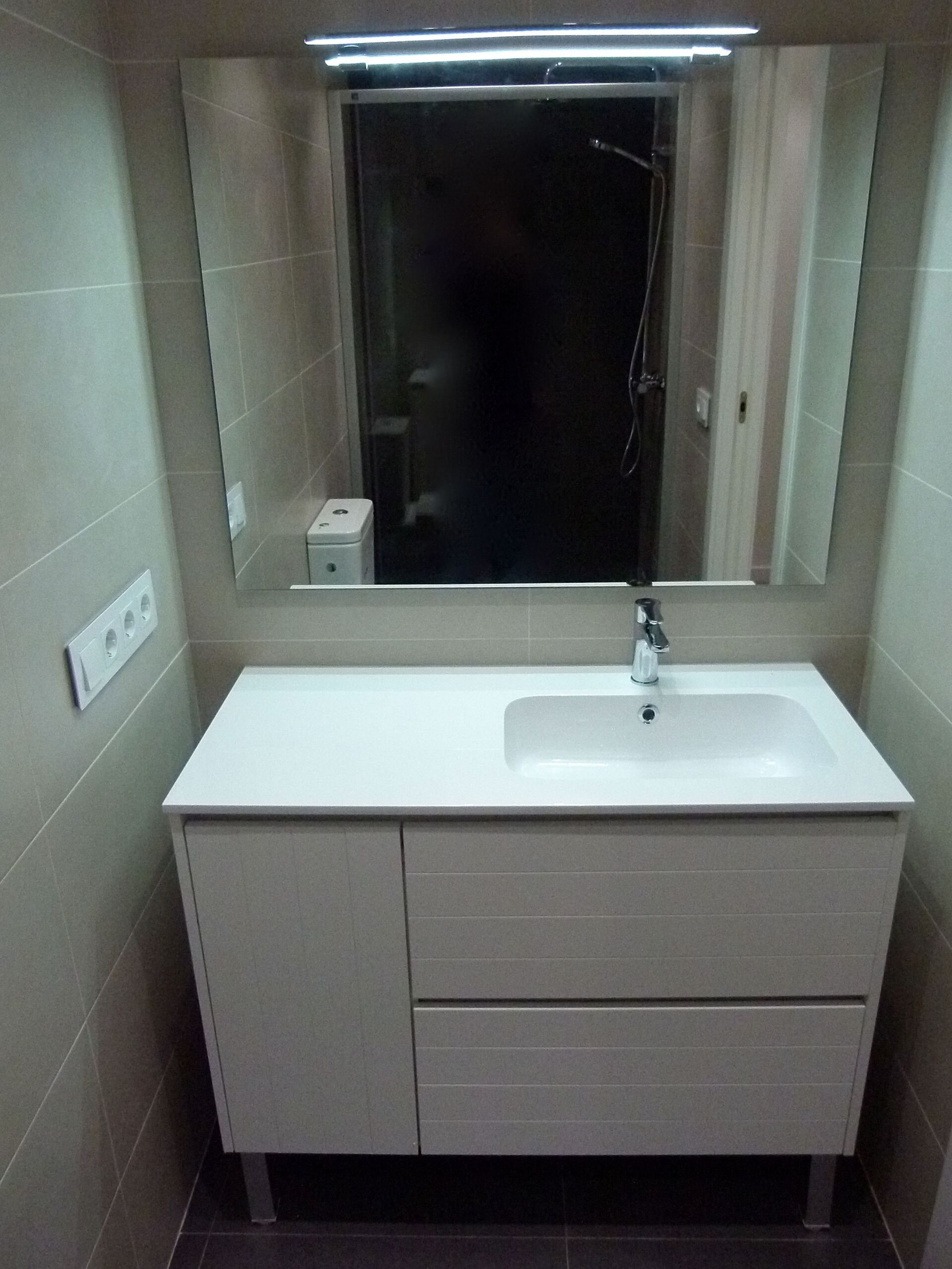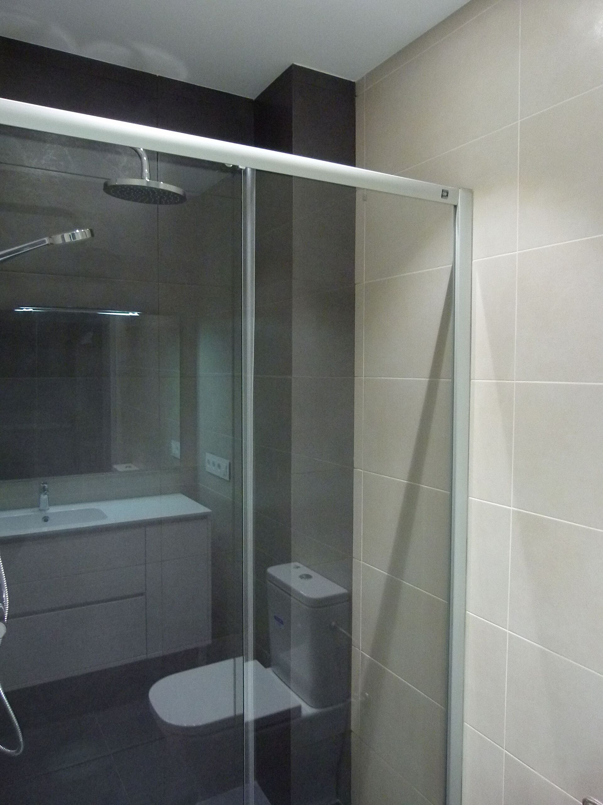Las actuaciones en el baño fueron las justas pero las necesarias, para tener un espacio agradable y con los principales elementos del mismo. En este baño hemos utilizado un techo con placas de yeso (Pladur) antihumedad para el techo, y unas bombillas (ojos de buey) con tecnología LED, para reducir el consumo energético de la vivienda. Toda la instalación eléctrica y instalación de agua realizada en esta reforma integral es nueva, así como las instalaciones de las tuberías y modificaciones en los desagües de los aires acondicionados.