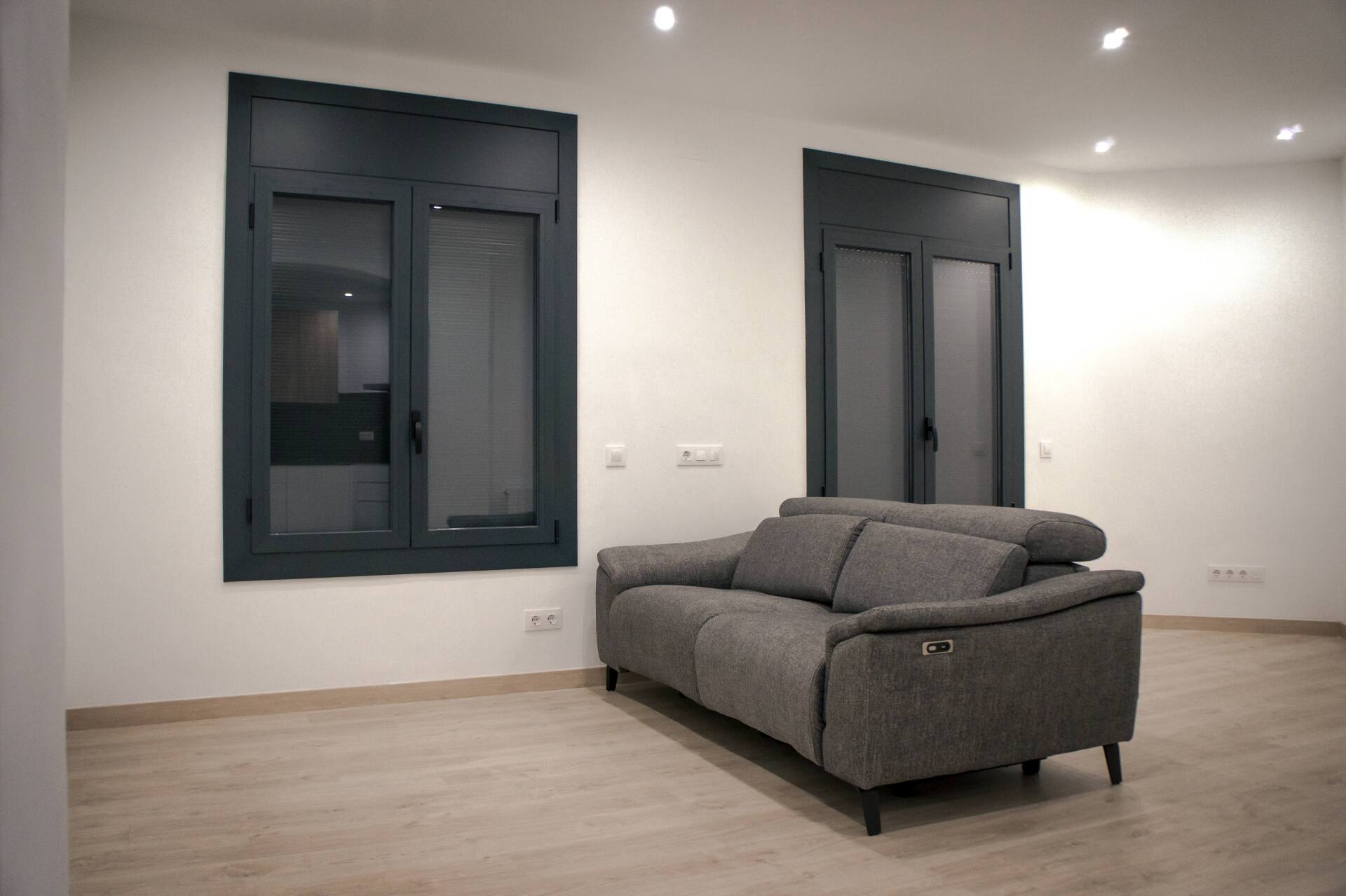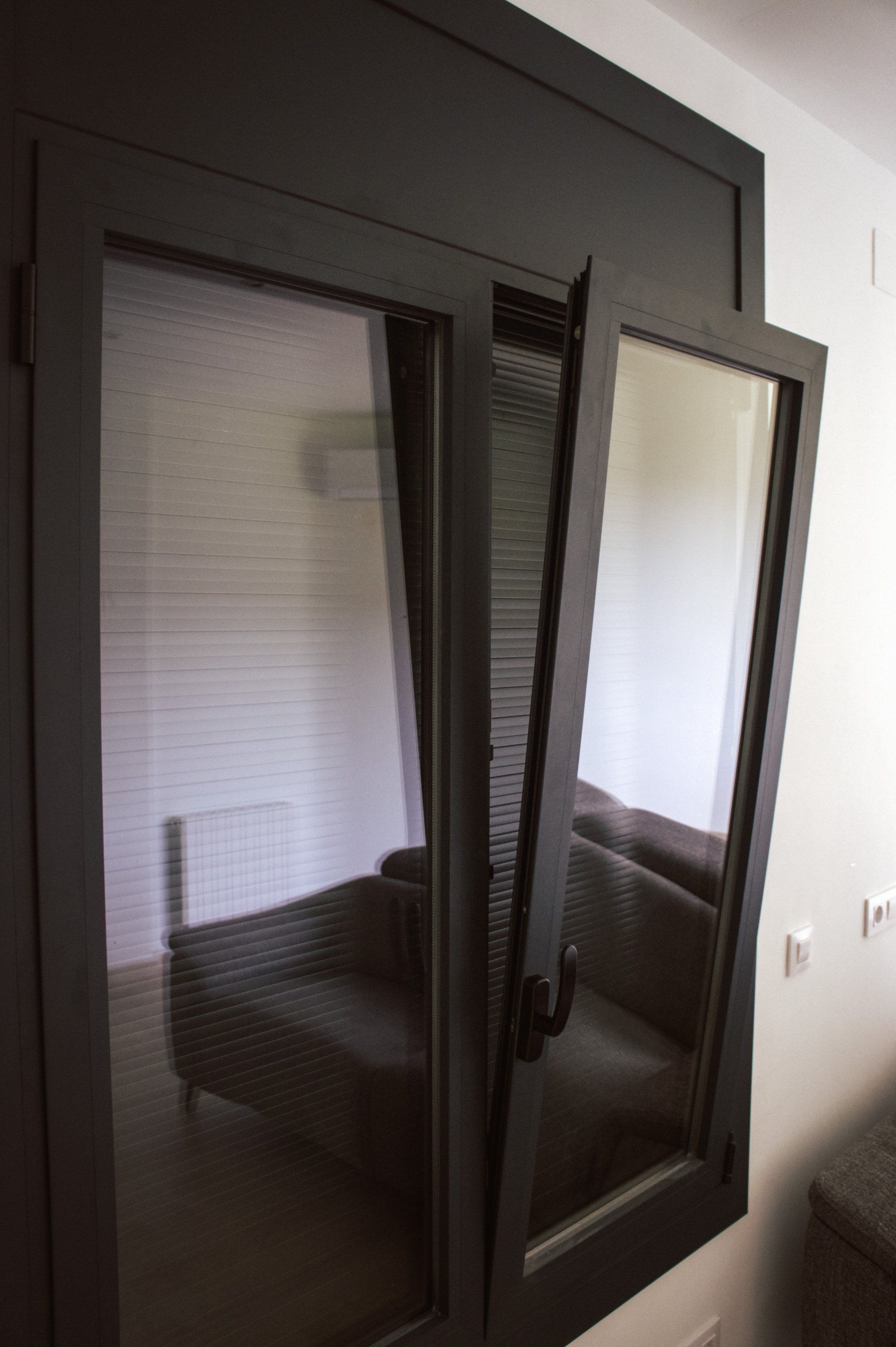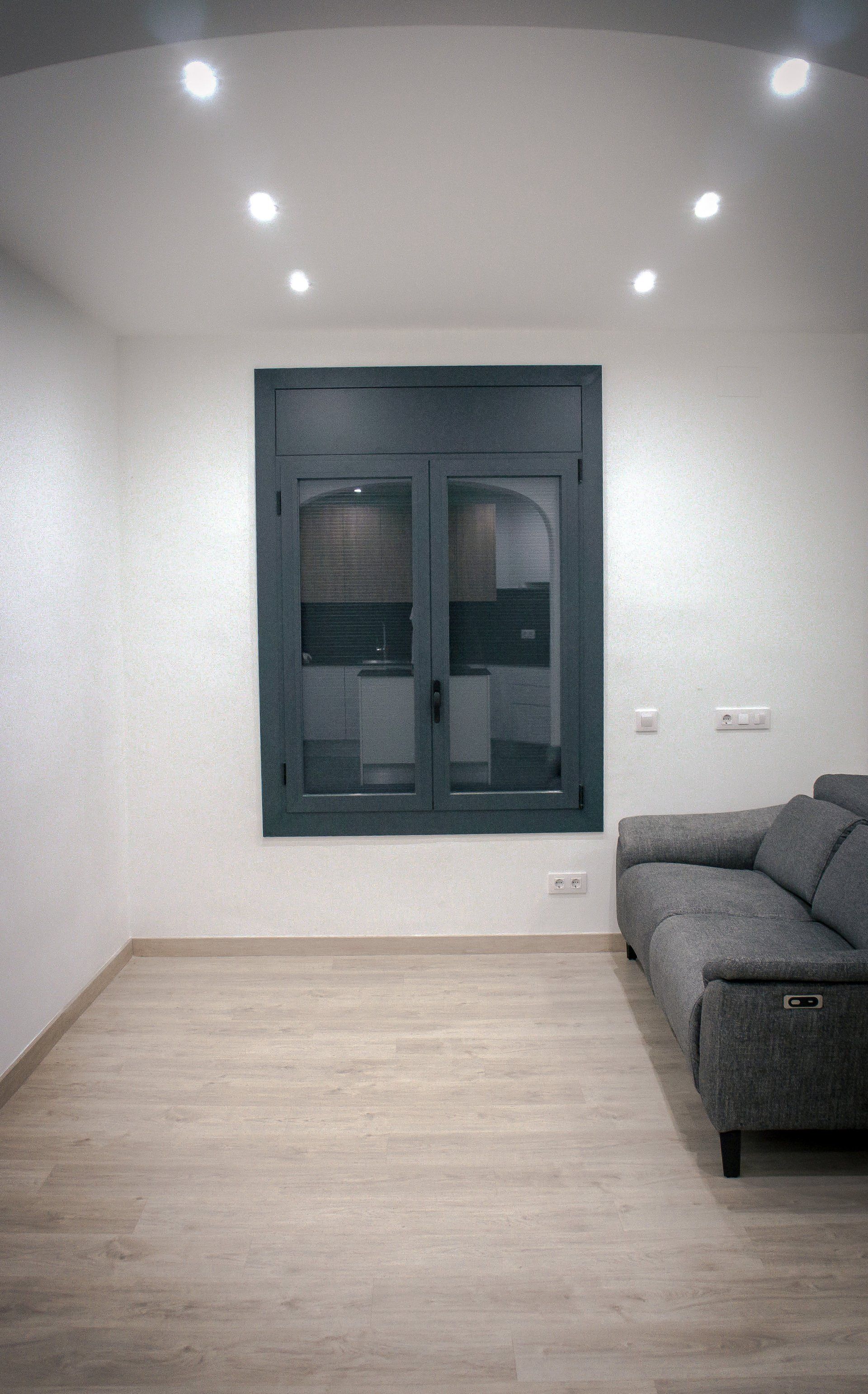 La carpintería de aluminio se ha decantado por la utilización de un color antracita (gris oscuro) con el cual salimos de esa sensación de frio que nos da el clásico aluminio en blanco, logrando al mismo tiempo, esa sensación de una armonía, una vez más, siguiendo la estética y tonalidad de colores que la cocina. Los cristales de las ventanas son con cámara de aislamiento tanto térmico como acústico.