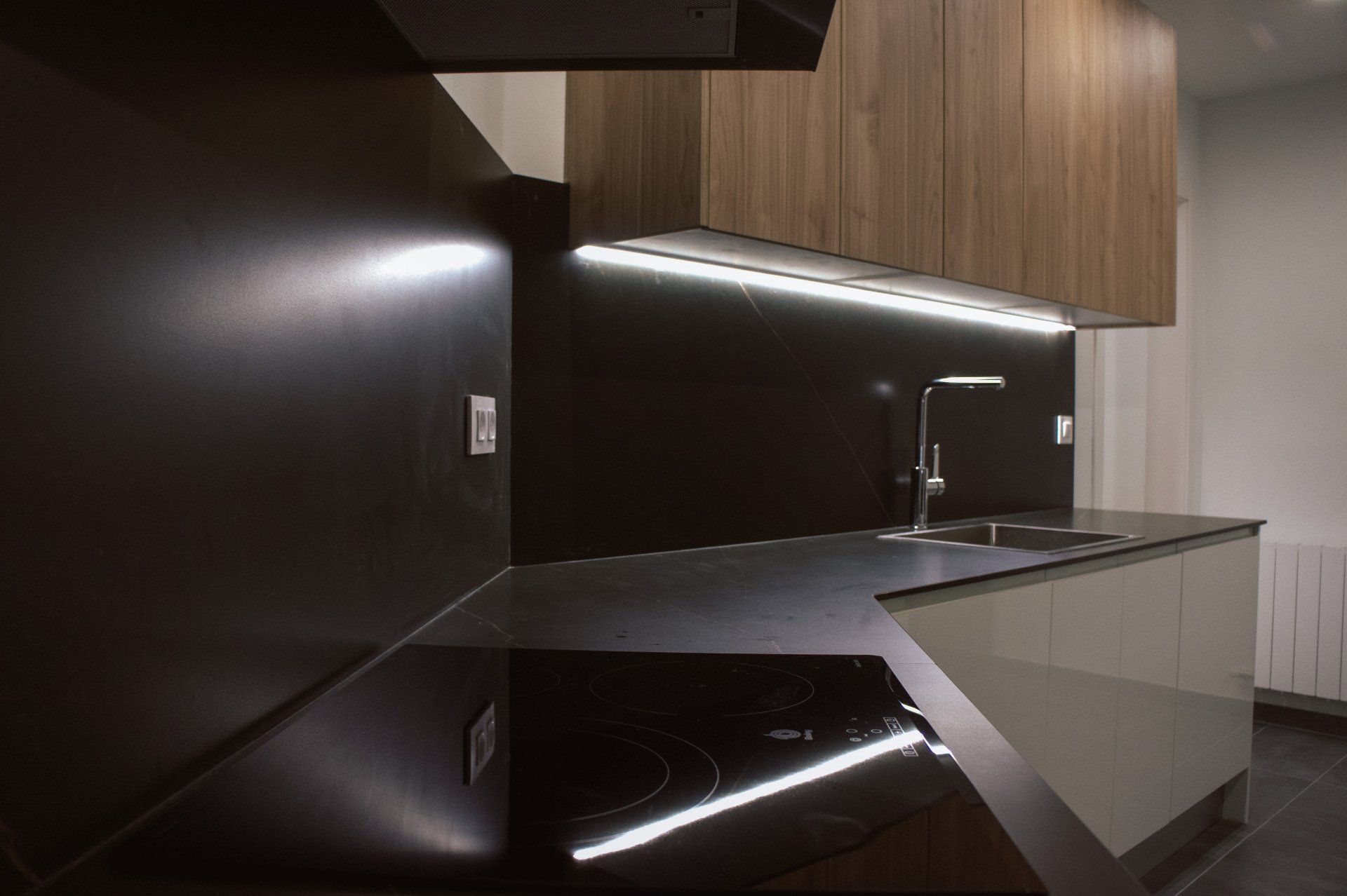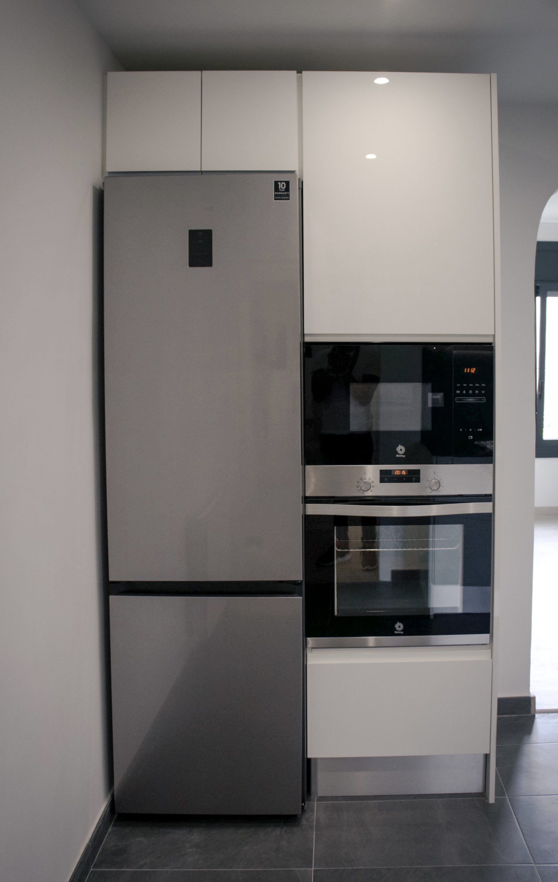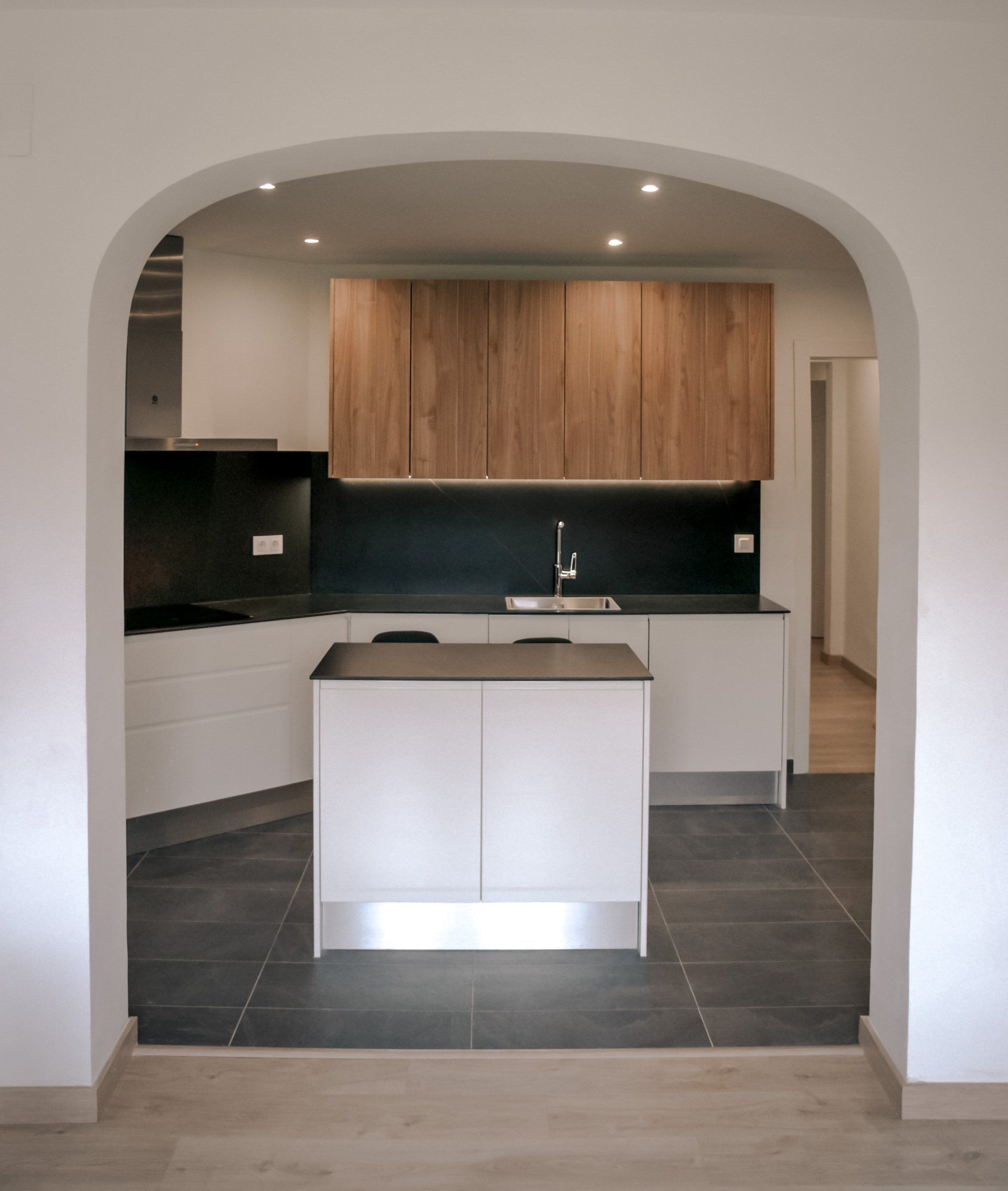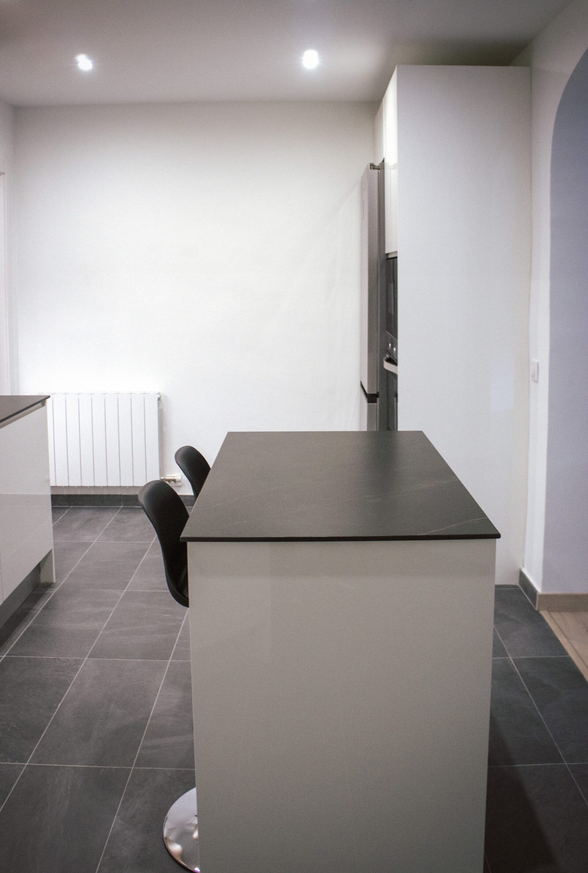 La redistribución que se ha logrado en este proyecto ha sido casi al completo, puesto que hemos cambiado la ubicación de la cocina llevándola al comedor, logrando así una única amplia estancia con el salón desde el cual poder disfrutar del diseño logrado en la reforma de la cocina, en la cual hemos incluido una pequeña isla para poder aprovechar al máximo el espacio disponible y ganando al mismo tiempo un óptimo resultado final. Los muebles de cocina son de un alto detalle y calidad del fabricante M-KIT del Grupo ALVIC y, para la parte más espectacular de esta cocina, nuestros clientes se decantaron por escoger una encimera y frontal de NEOLITH CALATORAO SILK 12MM. Finalmente los electrodomésticos elegidos son de la marca BALAY y BOSCH.